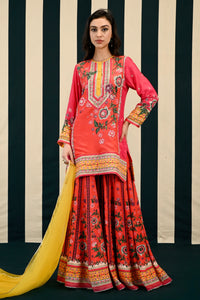 Fabric- Kurta: Silk, Sharara: Silk, Dupatta: Organza Color- Red/ Yellow Length- Kurta: 34", Sharara: 43" Details- Hand Embroidery Components- 3 Product Code- SVESWATSVJ 6278&SVJ 6282&SVJ 2712