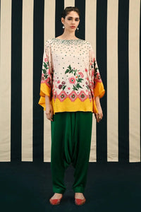 Featuring the Gulmohar Moksha Round Cape Set from Swati Vijaivargie’s Gulmohar Collection – embody elegance in this pristine ivory silk top, adorned with intricate mirror work and touches of emerald.