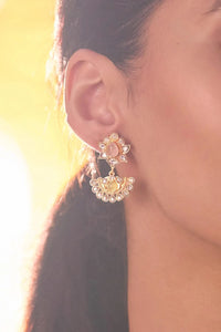 The Essence-This delicate pair of earrings has pink-hued Vintage Blush floral motifs and crescent motifs that are studded with brilliant Iceberg stones, surrounding Cerulean Haze stones.
