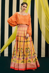 Featuring the Gulmohar Tarana Lehenga from Swati Vijaivargie’s Gulmohar Collection – dive into regal allure with this mustard silk ensemble. Adorned with intricate hand embroidery, the lehenga features full lining, cancan for volume, and a side zip, paired with a contemporary crop top that blends elegance with modern charm. A perfect statement for festive celebrations and timeless style.