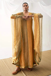 Featuring Gulmohar Yellow - Olive Kaftaan by ITRH's Sona Chandi Collection, this color-blocked kaftan is detailed with ghunghroo lines and antique dot embroidery on the sleeves. Its vibrant design and intricate embellishments offer a stylish and sophisticated look.