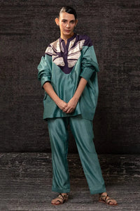 Featuring Relaxed silk-chanderi top with a soft drop shoulder and easy sleeves, finished with a statement brocade-tissue yoke across the chest.Paired with straight, narrow pants.