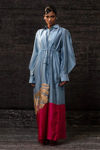 Composition: Dress: Chanderi Silk, , Lining : Shantoon Color: Blue , Pink Embroidery: Patch Fit: Comfortable Fit Components: 1 Product Code: SVEEEDA_Gulnaar_ShirtDress_BluePink