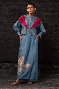 This blue two-piece Chanderi silk set features a relaxed overlay jacket-style top—wear it alone or layered with a bustier—paired with a sleek straight skirt. Enhanced with patch embroidery and a soft Shantoon lining, it offers a comfortable fit with effortless elegance and contemporary charm.