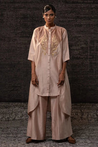 Featuring silk-chanderi straight kurta with a statement yoke—hand-embroidered Benarasi brocade-tissue appliqué. Easy, elbow sleeves with side slits for movement; paired with wide palazzo pants .