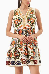 The Gulna a r dress is a bea utiful short dress cra fted in a soft white cotton linen, ma king it the perfect choice for a summer soirée or a girlie da y out! Ha ndcra fted with exquisite Suzeni embroidery - in ea rthy, tra ditiona l colors - which a dds a vibra nt touch of a rtisa na l cra ftsma nship to the Gulna a r dress - it’s perfect for a n a ma zingly fresh &a mp; elega nt look.