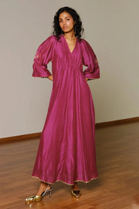 Featuring the deep rose-pink V-neck gown crafted from Chanderi silk. It showcases voluminous gathered sleeves, embroidered floral motifs on the arms, and delicate bijiya gota edging along the hemline. Fully lined and handcrafted in India, this elegant gown combines traditional artistry with modern style.