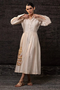 This ivory dress, crafted from elegant Chanderi silk with a soft 100% cotton lining, offers a refined blend of comfort and sophistication. Adorned with delicate patch embroidery, it features a comfortable fit, making it a perfect choice for graceful, effortless style.