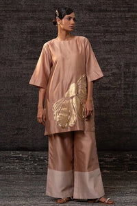 Relaxed silk-chanderi set with a relaxed kurta adorned with an oversized statement patch—bold and instantly elevating. Paired with wide palazzos with a contrast hem.