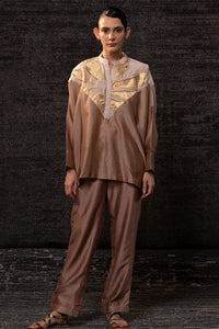 Relaxed silk-chanderi top with a soft drop shoulder and easy sleeves, finished with a statement brocade-tissue yoke across the chest.Paired with straight, narrow pants.