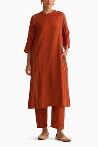 Rust orange kurta with placement floral buta motif, resham work & side seam pockets. Paired with embroidered straight pants.