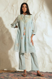 Step into a world of subtle charm with Gulzar, featuring a breezy, straight-cut top in a serene pastel blue hue. The top showcases delicate floral embroidery with playful tassel ties at the neckline, adding a touch of whimsy. Paired with straight pants, this ensemble offers a fresh and effortless look, perfect for daytime elegance.