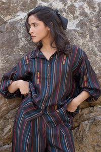 The Gwen Black Shirt is a chic oversized piece featuring multistriper patterns and delicate all-over hand-embroidered floral motifs. This unique blend of bold stripes and intricate embroidery adds a touch of sophistication, making it a perfect addition to any casual or elevated outfit.