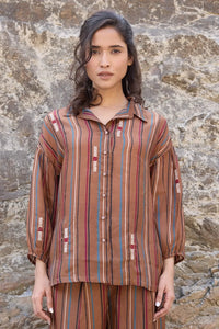 The Gwen Brown Shirt is a chic oversized piece featuring multistriper patterns and delicate all-over hand-embroidered floral motifs. This unique blend of bold stripes and intricate embroidery adds a touch of sophistication, making it a perfect addition to any casual or elevated outfit.