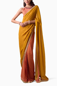 Haldi georgette saree with haldi pink printed pleats and solid color with neck embroidered blouse with gota lace border and handmade latkans.