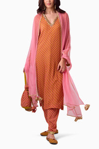 Haldi georgette teen patti printed kurta with intricate coin embroidery at the neckline paired with crepe teen patti printed salwar adorned with pink net dupatta , gota borders and handmade latkans with stylish potli bag.