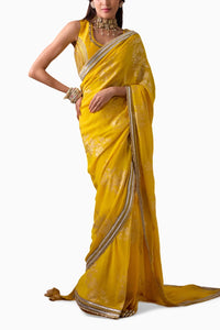 Haldi Phool georgette badal sitara gold foil printed saree with heavy hand embroidery and gota work pure raw silk blouse and handmade latkans.