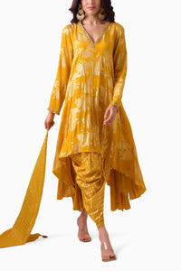 Haldi phool long asymmetrical foil printed kurta with intricate hand embroidery paired with foil printed crepe pleated dhoti pants and beautiful scarf with handcrafted intricate thread tassels.