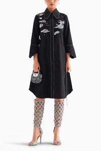 This black cotton satin knee-length dress features enchanting clouds and moon embroidery for a whimsical touch. It includes an oversized collar, piping detailing on the placket, and a fabric detachable belt. With side pockets and a relaxed fit, it combines comfort and style effortlessly.