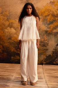 A vision in silk organza, our Hana Organza Top isdesigned with screen printed cotton panels and adelicately crafted jaal yoke, blooming like a flower.Dramatic gathers cascade down the front, addingmovement and flair, while its versatility makes itsuitable for both elegant evenings and casual outings.An ethereal yet wearable masterpiece.