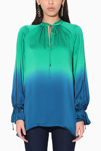 This top features a hand-done, saturated ombre effect, blending rich, vibrant hues for a stunning gradient. The sleeve tie-up detail adds a playful, feminine touch, elevating the design with a chic, relaxed feel—perfect for casual outings or dressed-up moments.