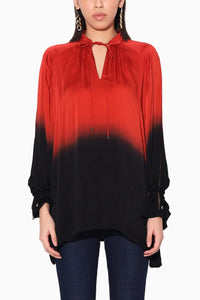 This top features a hand-done, saturated ombre effect, blending rich colors for a striking, gradient look. The sleeve tie-up detail adds a playful, feminine touch, making it a unique and stylish piece perfect for both casual and dressed-up occasions.