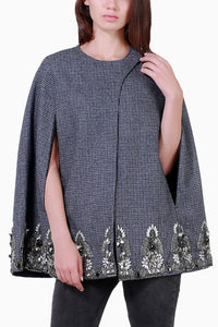 Featuring a Grey-Black Tweed Cape with intricate hand embroidery along the bottom, this stylish piece combines warmth and elegance. Crafted from high-quality wool, it offers superior comfort and insulation, making it perfect for colder weather. The hand-embroidered detailing adds a touch of artisanal charm, elevating the classic tweed fabric with a unique, sophisticated flair. Ideal for layering over both casual and formal outfits, this cape is a versatile and luxurious addition to any wardrobe.