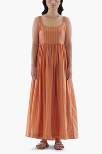 Our Hand-in-Hand dress is a lovely fit-and-flare silhouette crafted in handwoven striped silk modal. The pink and orange stripes bestow an ethereal charm to this sleeveless gathered silk dress.