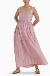 Our Hand-in-Hand dress is a lovely fit-and-flare silhouette crafted in handwoven striped silk modal. The dual-toned pink stripes bestow an ethereal charm to this sleeveless gathered silk dress.
