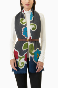 Our collection of Shawls in 100% Merino Wool for modern and resourceful women. The entirely hand-painted floral scarf is characterized by a size of 70 x 180 cm and katha style embroidery details making the stole truely one of a kind. Perfect to be wrapped around the neck and wear it in a casual and contemporary way.