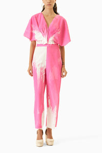 Printed pant set in white and fuchsia inspired by a hand-painted technique. Kaftan-inspired sleeves that gather as pleats at the front. Hook and eye closure. Paired with complementing straight fit pants. Elasticated at the back. Hook & eye and zip closure
