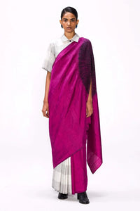 Our signature Handsfree Saree in handwoven silk. The checkered pleats gives way to a solid magenta silk body with a contrast black sleeve in the pallav. The saree is handwoven on a traditional loom and is designed to move from checks in the pleats to a magenta body while weaving. It comes with an unstitched check silk blouse piece as in image.
