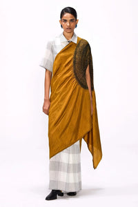 Our signature Handsfree Saree in handwoven silk. The checkered pleats gives way to a solid mustard silk body with a contrast black sleeve in the pallav. The saree is handwoven on a traditional loom and is designed to move from checks in the pleats to a mustard body while weaving. It comes with an unstitched check silk blouse piece as in image.