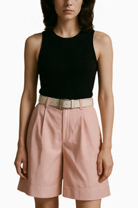 A modern staple with artisanal detailing, these pink pinstriped Bermuda shorts blend tailored ease with handcrafted charm. Cut from airy cotton in a relaxed silhouette, they feature front pleats, curved side pockets, and a clean waistband that transitions into a softly gathered elastic at the back. The standout detail—a line of visible white hand stitches along the hem—adds a touch of thoughtful imperfection. Designed to sit comfortably at the waist, these shorts offer effortless wearability with a subtle sculptural shape.