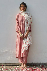 This Handwoven Cotton Silk Co-ord Set in a captivating Persian rose shade combines elegance with comfort. The kurta features a relaxed fit, pintuck detailing on the yoke, gathered sleeves, and is adorned with delicate mallipoo hand block prints. Paired with matching trousers and a rose and jasmine hand block print half-width stole, enhanced with intricate lace detailing, this ensemble is a perfect choice for graceful, everyday sophistication.