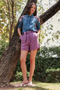 Featuring Hanna Co-ord by San Seh, this delicate set features a front-buttoned shirt in pure summer silk with ruffle and pintuck detailing, paired with solid lavender shorts for a soft, feminine finish.