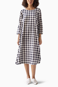 Featuring a black and white check mul dress with side tie-up gather detail and 3/4 sleeves that completes the look.