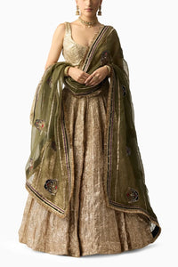 Turn heads in the Hara Katputli Dupatta Chandi Lehenga Set, showcasing a silver lampi lehenga and blouse paired with an olive silk organza dupatta, hand-embroidered with katputli motifs and finished with kiran edging. Crafted from silk organza, this ensemble blends tradition with timeless elegance.