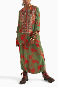 Elevate your look with the Hara Mitra Short Kurta with Drape Trouser Set. The Tie-Dye Printed Short Kurta features front embroidery and pairs gracefully with printed draped trousers and printed dupatta. Crafted from natural crepe, offering relaxed-fit comfort. Bead work embroidery adds a touch of elegance.