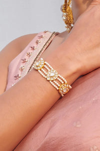 The Essence-Embodying the grace and opulence of Mughal fabrics, this bracelet woven with pearls and paisley motifs, drapes the wrist of the wearer with the fluidity of soft silks.