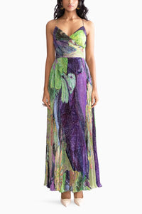 Featuring Harlow Green Dress by Saaksha & Kinni from Botanica Collection. This daisy print hand micro pleat maxi dress adorns a surplice bodice and delicate noodle straps.