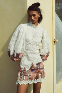 Exude elegance in the Harmoni White Dress. This stunning high-collar dress features exquisite town embroidery on delicate lace, making it a perfect choice for special occasions and charming outings.