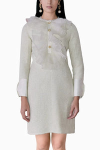 Featuring Tweed dress with open satin cuffs and organza ruffles with gold buttons