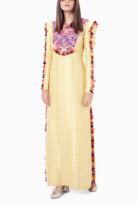 Featuring Pale yellow colour Ikat Brocade georgette yoke embroidered high-slit kaftan with colourful tassels.