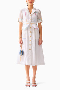 The Hathway white nylon and cotton dobby dress features vibrant color block piping details and scalloped lace accents on the sleeves and hemline. This button-down A-line dress has elbow-length sleeves with folding cuffs, patch pockets, and wooden buttons. It is fully lined for comfort and includes a matching peplum belt with shell tassels and drawstring adjustments. The elastic back and color block contrast at the bottom offer an adjustable, flattering fit.