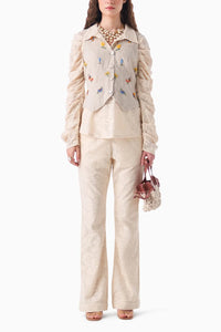 Featuring a Cotton Lace Havana ivory co-ord set paired with a linen embroidered waist jacket. The fitted jacket showcases hand-embroidered florals, button details, and a back adjuster. The straight-fit sheer lace shirt features statement gathered sleeves, while the fit-and-flare lace pants come fully lined with side pockets, a back elasticated waist, and side zipper—combining elegance with refined craftsmanship.