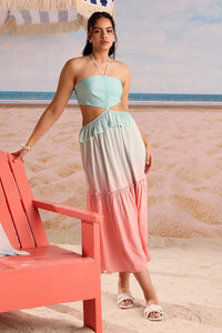 Breeze through summer days in this dreamy pastel ombre Havana Co-ord Set, featuring a ruched bandeau top with halter neck ties and a flowing tiered maxi skirt. The soft aqua-to-coral gradient adds a refreshing, beach-ready vibe perfect for vacations or casual outings.Pair with white slides and delicate pearl accessories for an effortlessly chic, sunlit look.