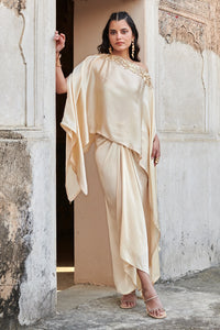 Divine into elegance with the cape skirt set. Crafted from satin silk. The cape is adorned with hand embroidery and tassel accent. Paired with a draped skirt with back zip closure.