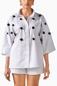 A white tencel cotton shirt with floral beaded detailing, adding intricate textures to the fabric.
