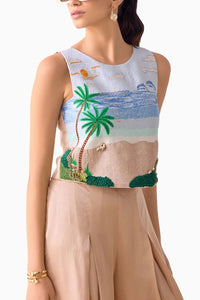 The Hawaii ecru Bamberg satin embroidered crop top features sea-beach inspired machine and hand embroidery. With a round neck, sleeveless design, and back button closure, this top offers a comfortable fit, combining style and ease effortlessly.